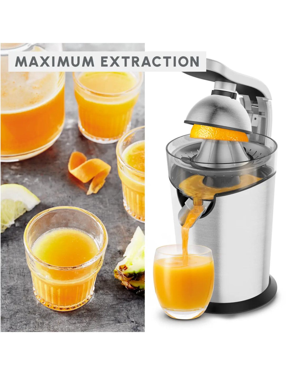 Savourez chaque matin un jus frais et plein de vitalité avec le presse-agrumes électrique Moulinex Vitapress Pro PC700D10. Grâce à son moteur puissant de 300 W et son cône en acier inoxydable, il assure une extraction maximale du jus tout en conservant les saveurs naturelles. Son levier à pression ergonomique et son système anti-goutte garantissent une utilisation propre et sans effort, idéale pour un usage quotidien