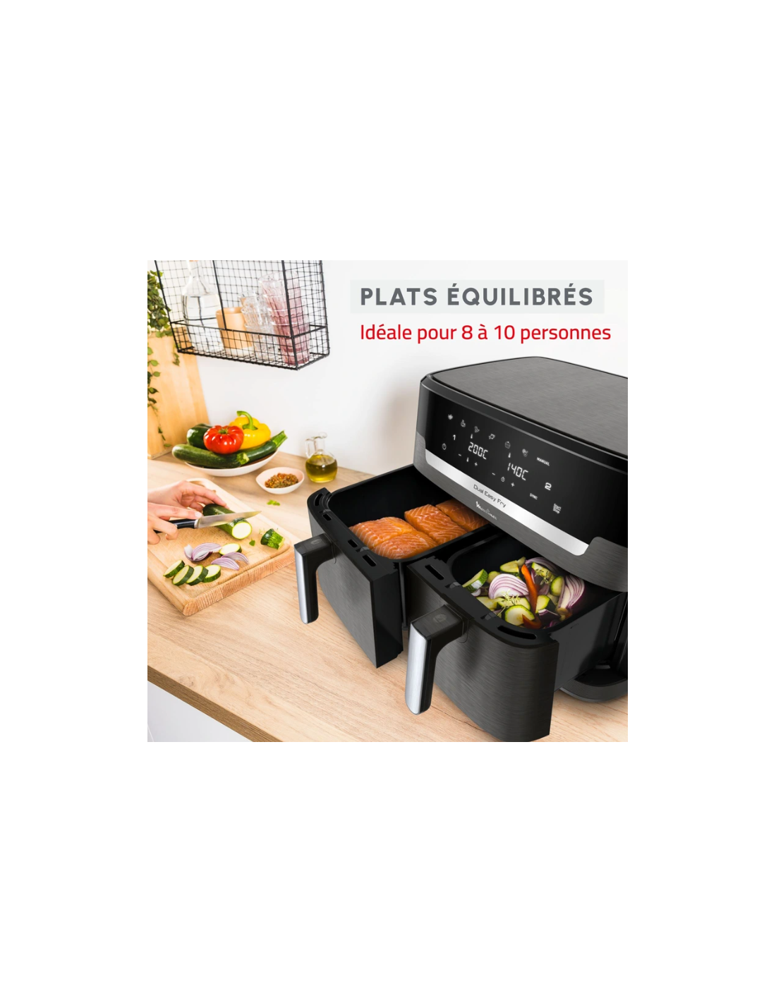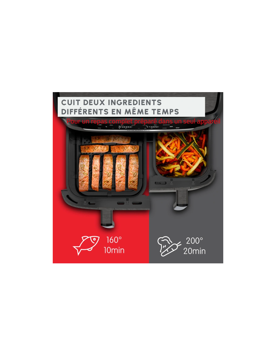 Avec ses deux tiroirs indépendants et sa technologie de cuisson synchronisée, vous pouvez préparer un repas complet en une seule fois : frites croustillantes d’un côté, poulet, poisson ou légumes grillés de l’autre.